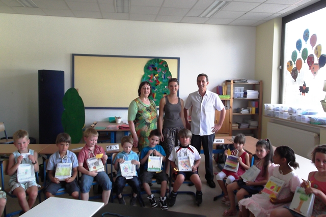 Frau Kahla vom Manar Buchladen, Lehrerin Frau Diem und Herr Langer vom Förderverein der Grundschule bei der Übergabe der Lesetüten